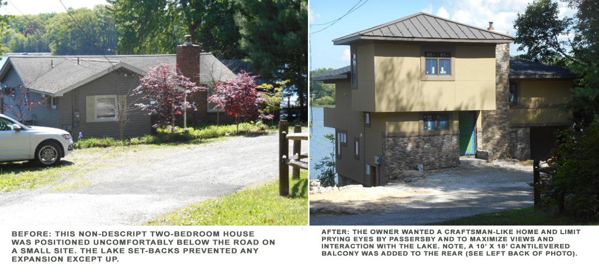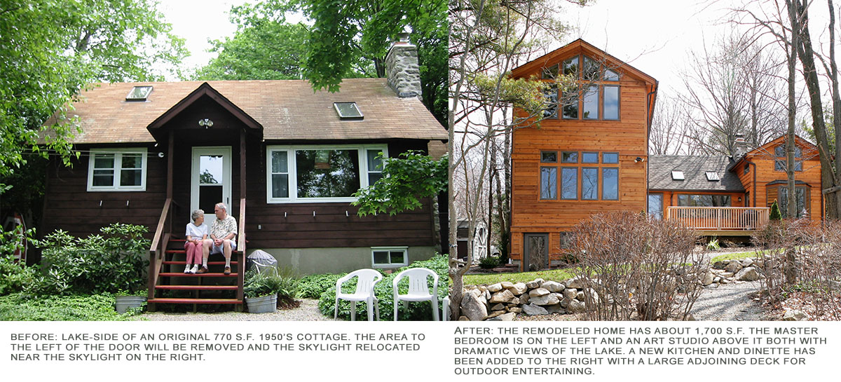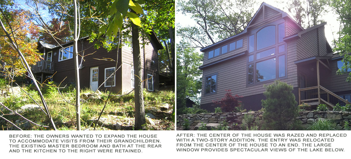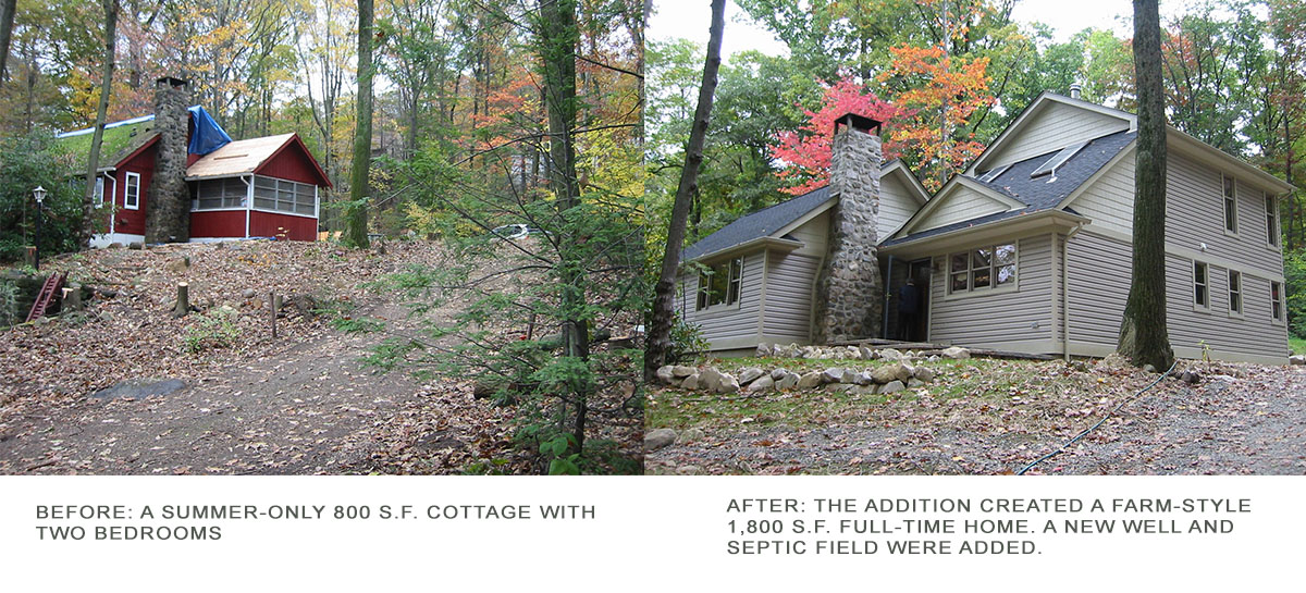 The challenge: create an addition almost twice the size of the original small cabin, make the totality a unified structure, do so with the owners largely absent, and work with a very tight budget. The result: success on each and every count. The background: our extended family owned a vacation house in Highland Lakes NJ for about 25 years. As the family grew from 4 adults with 9 kids (total) to 18 adults and 10 kids, the need to expand was clear. We found Jim Schriner's Highland Architectural Design firm simply by walking around the area and seeing his designs. We saw in his work a unique ability to merge the new with the existing. He began by asking what our needs were - how we used the house, how often we were there, what the priorities were. He delivered some preliminary ideas for the owners (who are spread all over the US) to consider. He refined the initial ideas and after careful consideration as to the site conditions and potentials, came up with a proposal that was 180 degrees away from what we had thought we wanted, but which turned out to be a much better and effective idea than any we had considered among ourselves. Once the final plans were agreed upon, Jim helped us find a contractor to do the work. When estimates came in, we were delighted to find out that his design was affordable and within our budget. Jim also knew how to get our plans approved expeditiously by the Vernon authorities. Since none of us live really close to the house, we were not available to be present to oversee the work, except upon occasion. Jim visited the site frequently, and in effect acted as site manager for us. Doing construction is always difficult, but doing it long-distance is even more difficult. Jim was our salvation. The outcome: 5 years later, we remain thrilled with the work. As the family continues to grow, we can be assured that our vacation house will remain a gathering place for family get-togethers and reunions for years to come. And since some of the original owners are retired, we're spending more time than ever there. We would recommend him to anyone!